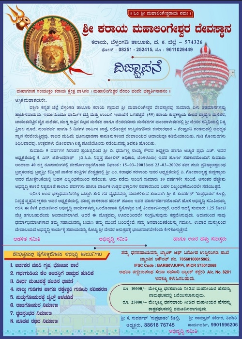 Shri Mahalingeshwara Temple, is situated in Karaya Village, which is 5 Kms away from Uppinangady City,